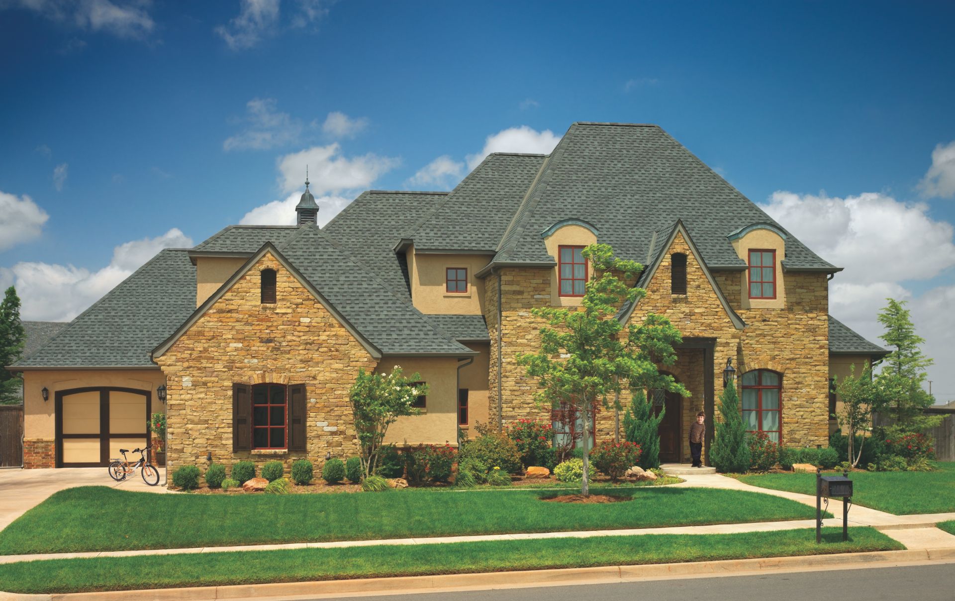 The image shows a large, elegant house with a stone exterior and dark asphalt shingle roofing, under a clear blue sky. It highlights the quality and appearance of premium residential roofing work.